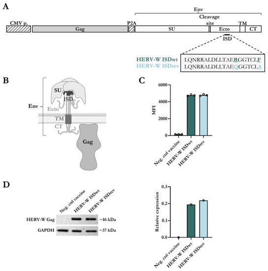 We generated two HERV-W vaccines to assess the immunogenicity of the ISD: one vaccine containing the wild-type HERV-W Env sequence of Syncytin-1 (HERV-W ISDwt); and one vaccine encoding this Env sequence but with two mutations in the ISD (R > Q and F > A) (HERV-W ISDrev), as originally defined by Mangeney et al. (Figure 1A) [30]. Both vaccines were designed to potentially obtain Gag-protein based VLPs covered with the Env protein on the surface. To explore this property, we encoded the Env sequences together with an assembled sequence of HERV-W Gag [39] separated by a self-cleavable P2A peptide sequence. The full-length Syncytin-1 Env (from now HERV-W Env) sequence consists of two subunits: the surface subunit (SU); and the transmembrane subunit (TU), which contains an ectodomain (Ecto), a transmembrane region (TM), and a cytoplasmic tail (CT) (Figure 1A,B). The HERV-W vaccines were incorporated into a replication-deficient human adenoviral vector type 19a/64 (hAd19a/64) under control of a CMV promoter. The expression level of the vaccine antigens was evaluated in vitro in the human A549 cells, which are easily transduced by the hAd19a/64 vector. Similar levels of Env surface proteins were expressed by both vaccines as determined by flow cytometry (Figure 1C, Supplementary Figure S1A,B). In addition, comparable expression levels of intracellular Gag protein were confirmed by western blot of cell lysates (Figure 1D). Furthermore, the ISD mutations did not impair the HERV-W Env fusion activity in human T24 cells (Supplementary Figure S1C), implying that the main mechanical fusion activity of the Env was not altered by the ISD mutations, as previously described by Mangeney et al. [30].