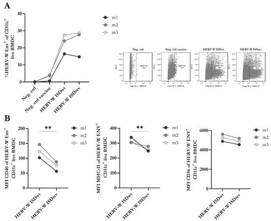 Analysis of activation markers and HERV-W Env on transduced BMDCs. Flow cytometry of matured bone-marrow-derived dendritic cells (BMDCs) isolated from BALB/c mice (n = 3) and transduced with either the empty hAd19a/64 vector (Neg. ctrl vaccine), the HERV-W ISDwt vaccine, or the HERV-W ISDrev vaccine at 1000MOI, 24 h prior to analysis. (A) The graph to the left depicts the percentage of HERV-W Env expressing BMDCs out of CD11c+ live cells. The right panel of dot plots illustrates the most representative gates of HERV-W Env+ cells. (B) Geometric mean fluorescent intensity (MFI) of activation markers on HERV-W Env+ CD11c+ live BMDCs. The graphs show the MFI of CD40, MHCII, and CD86 arranged from left to right. The bullets depict the mean of three technical replicates per mouse (m1-3). Lines link BMDCs transduced with either of the HERV-W vaccines from the same mouse. Expression differences were calculated using a two-tailed paired t-test and statistical significance is indicated with asterisks; ** = p < 0.01.