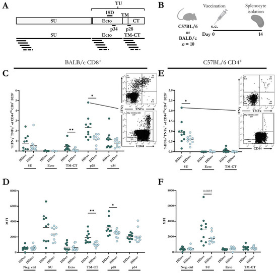 CD8+ T cell responses were also induced towards the peptide pools of the SU domain and the single peptide p34 of the Ecto-region but without significant differences between the two vaccines (Figure 3C,D, Supplementary Figure S3D). Both vaccines, however, exhibited poor CD4+ T-cell responses in BALB/c mice (Supplementary Figure S3E–G).