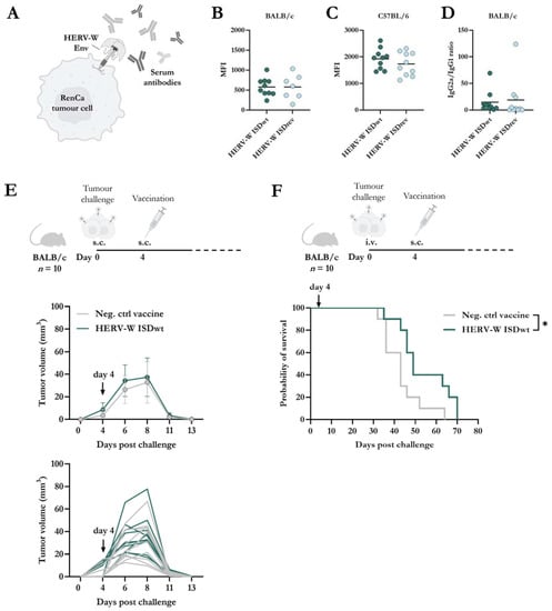 Antibody responses and therapeutic vaccine efficacy against HERV-W Env-expressing RenCa cells. (A) Graphical illustration of the binding of antibodies to HERV-W Env protein on the surface of a RenCa tumour cell (HERV-W Env+ RenCa), created using BioRender.com. HERV-W Env+ RenCa cells were stained with serum from BALB/c (B) or C57BL/6 (C) mice, 14 days after vaccination with either HERV-W ISDwt or HERV-W ISDrev (n = 10). Serum binding was analyzed by flow cytometry. (B,C) Geometric mean fluorescent intensity (MFI) of serum IgG binding to HERV-W Env+ RenCa cells. MFI was evaluated from live cells with each sample run in duplicates. Each bullet represents the mean of the duplicates for each mouse, and the line shows the mean. The results of three mice were excluded from the ISDrev group due to high background in the pre-immune serum. Response differences were calculated by a non-parametric two-tailed Mann–Whitney test. (D) Total HERV-W-specific IgG2a/IgG1 isotype ratio of serum from the vaccinated BALB/c mice. Each bullet represents the mean of the duplicates for each mouse, and the line shows the mean of the group. (E,F) BALB/c mice were challenged either subcutaneously (s.c.) (E) or intravenously (i.v.) (F) with 0.5 × 106 HERV-W Env+ RenCa cells on day zero. On day 4, mice were immunized with 2 × 107 infectious units of either the control vaccine (Neg. ctrl vaccine) or the HERV-W ISDwt vaccine (n = 10). For s.c. injection, tumour growth was measured with a calliper over a period of 14 days (E), while for the i.v. injection, mice were euthanized when reaching humane endpoints, and tumour nodules in the lungs were evaluated (F). (E) Bullets indicate the mean and whiskers show the standard deviation. Lines without whiskers and bullets illustrate the mean. (F) Grey lines represent mice vaccinated with the negative control vaccine, and green lines represent HERV-W ISDwt-vaccinated mice. Arrows indicate the day of vaccination. Statistical survival difference was analyzed by a log-rank test (Mantel-Cox), * = p < 0.05.