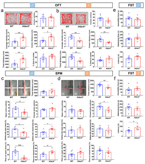 The effects of HDAC6 loss on the behaviors in mice. (a,b) The result of open field test (OFT) in male (a) and female (b) WT mice and Hdac6−/− mice. (c,d) The result of elevated plus maze (EPM) in male (c) and female (d) WT mice and Hdac6−/− mice. (e,f) The results of forced swimming test (FST) in male (e) and female (f) WT mice and Hdac6−/− mice. n = 5–8, * p < 0.05, ** p < 0.01, *** p < 0.001.