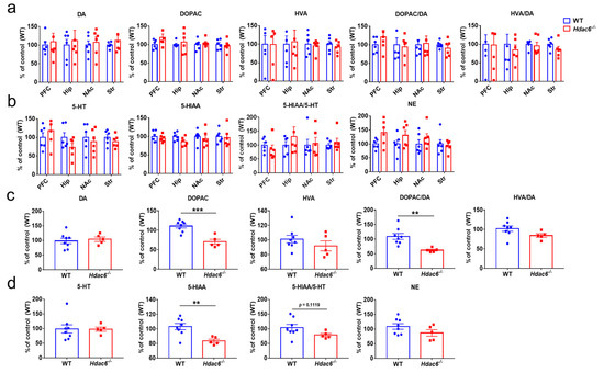It has been observed that HDAC6 deficiency may cause anxiety-like behavior in males and a slight anti-depressive effect in females. As is known, the occurrence of anxiety and depression is often associated with the changes of monoamine neurotransmitters including dopamine (DA), serotonin (5-HT) and norepinephrine (NE) in the relevant brain regions such as the prefrontal cortex (PFC), nucleus accumbens (NAc), hippocampus (Hip) and striatum (Str) [73,74,75,76,77,78]. Therefore, monoamine levels in the above brain regions were detected in both KO and WT mice of different genders. To our surprise, HPLC results showed no change in the contents and metabolic levels of DA, 5-HT and NE in the PFC, NAc, Hip and striatum in male mice regardless of the presence of HDAC6 or not (Figure 2a,b). The results in female mice were different from those in male mice, mainly in terms of the striatal metabolism of DA and 5-HT. The contents of 3,4-dihydroxyphenylacetic acid (DOPAC), 5-hydroxyindoleacetic acid (5-HIAA) and the ratio of DOPAC to DA were significantly decreased in female mice, indicating the metabolic rate of DA decreased (Figure 2c,d).