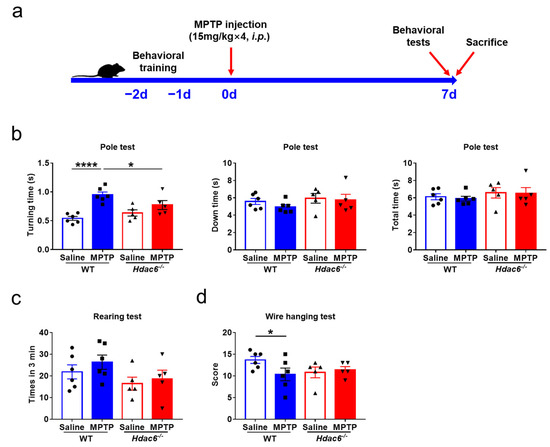 The effects of HDAC6 loss on PD-related motor injuries induced by MPTP injection in male WT and Hdac6−/− mice. (a) The experimental schedule. (b–d) PD-related behavioral tests were performed on mice at 7 days after the last injection of MPTP or NS. (b) The results of pole test. (c) The results of rearing test. (d) The results of wire hanging test. n = 5–6, * p < 0.05, **** p < 0.0001.