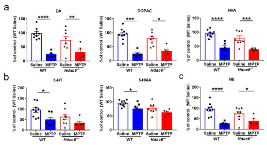 2.5. HDAC6 Deficiency Does Not Affect MPTP-Induced Changes of Monoamine Neurotransmitters in the Striatum of Mice