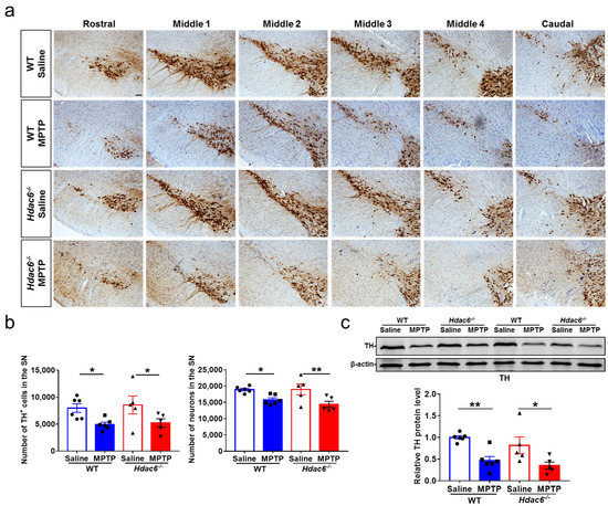 The homeostasis of monoamine neurotransmitters is maintained by the constant number of DA neurons and synaptic activity [79,80]. With immunohistochemical staining (IHC) and Nissl staining, as well as cell counting, we found that the reduction in the number of dopaminergic neurons and total neurons in the SNpc induced by MPTP intoxication was not influenced by HDAC6 deficiency in male mice (Figure 5a,b). In the striatum, the levels of TH proteins were significantly decreased in MPTP-treated WT and KO mice; there was no difference between the two genotypes of male mice (Figure 5c). However, in MPTP-treated female WT mice, the levels of striatal TH proteins were significantly reduced compared to the control WT mice and MPTP-treated female KO mice (Figure S4a,b). Therefore, the impact of HDAC6 deficiency on MPTP-induced damages to the nigrostriatal dopaminergic system has a certain difference in male and female mice.