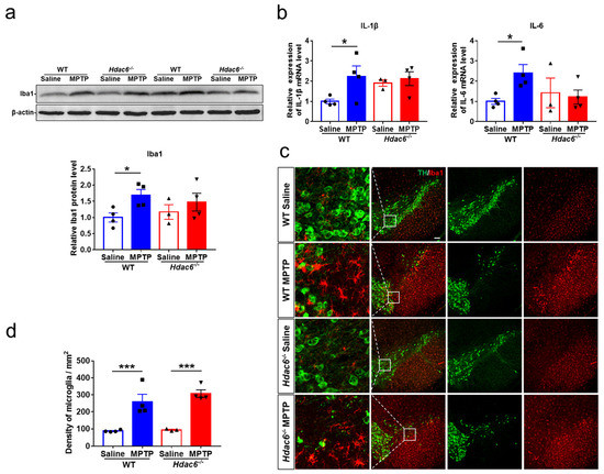 2.7. HDAC6 Depletion Does Not Influence MPTP-Induced Glial Activation