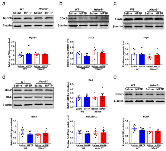 The expression of molecules associated with inflammatory pathways in the striatum was further investigated. Our results showed that the levels of COX2 and MyD88 proteins in PD mice were not influenced by HDAC6 deficiency (Figure 8a,b). Owing to the fact that HDAC6 is involved in the autophagy pathway to remove abnormal accumulation of proteins in cells, such as α-syn in PD, the expression of α-syn proteins in the striatum was detected, but there were no differences among all groups (Figure 8c). Moreover, we explored the apoptotic signaling pathway, since autophagy and apoptosis, as two coordinated modes of cell death, both occur in PD [84,85]. HDAC6 depletion had no effect on the expression of apoptosis-related proteins, such as B cell leukemia/lymphoma-2 (Bcl-2) and Bcl-2-associated X (Bax), in the striatum of PD mice (Figure 8d). The striatal levels of brain-derived trophic factor (BDNF) also did not differ in the four experimental groups of mice (Figure 8e). These results suggest that the expression of molecules related to inflammatory or apoptotic pathways in the striatum was not affected by HDAC6 deficiency.
