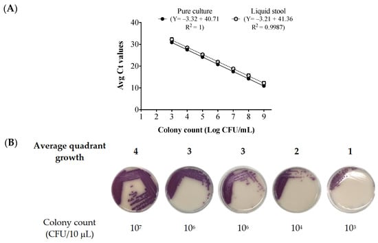 Based on the standard curve generated using different dilutions of bacterial cells spiked into stool broths (Figure 1A), the Ct values obtained for the post-enrichment qPCR (Table 1) can roughly predict the range of bacterial load in the enriched MSB. Accordingly, the enriched stool broths consisted of ~108–109 CFU/mL based on the standard curve (Figure 1A) and the observed quadrant growth was 3–4. According to the qPCR readings and the correlation between the average quadrant growth and average Ct values (Figure 2), 3–4 quadrants growth was predicted when Ct values < 16.