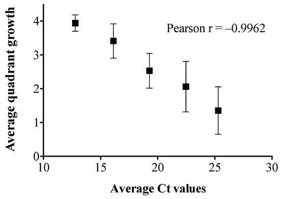 Correlation between the average Ct values and average quadrant growth of the liquid stool spiked with different S. Enteritidis cell dilutions.