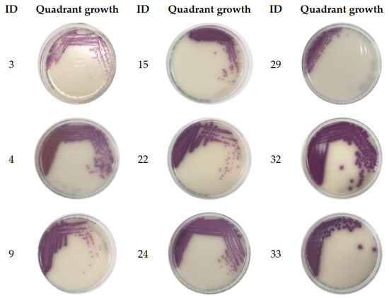No qPCR inhibition was observed in the amplification of neat (undiluted) or a 1/10 dilution of DNA extracted from spiked culture in stool broth samples (Supplementary Table S1). From the stools analyzed, 76/85 (89%) showed positive qPCR and vPCR results (Supplementary Table S1), pointing to a vPCR assay sensitivity of ~89%. Twenty-four of these samples had a Ct difference (ΔCt) of < 1 between qPCR and vPCR results. For 14/76 stools, the ΔCt for vPCR-qPCR was > 3. Nine stools tested negative for both qPCR and vPCR (vPCR and qPCR Ct ≥ 31), where 4/9 were qPCR negative. All vPCR-negative stools (n = 9) were enriched in Mannitol Selenite Broth (MSB) overnight to verify the presence of low viable bacterial loads. qPCR analysis on aliquots of the post-enriched stool broths showed a significant Ct reduction (p < 0.05) compared to pre-enrichment with CT values ranging between ~11 and 18. The ΔCt between pre-enrichment vPCR and post-enrichment qPCR was > 17 Ct values (Table 1). Furthermore, the viability of the bacteria post-enrichment was confirmed via the growth of 3–4 quadrants of mauve colored colonies on CHROMagar™ Salmonella Plus plates, except for ID 29 (Figure 3). The growth of only one quadrant for the enriched ID 29 stool was an unanticipated observation.
