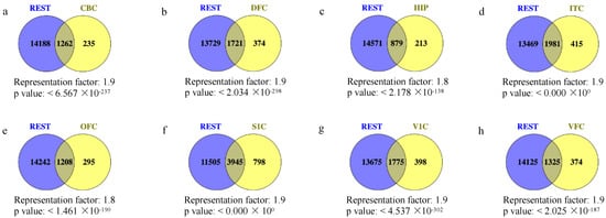 (a–h) The overlap between REST target genes and DEGs in different brain regions, respectively. The statistical significance of overlapping genes was tested using Fisher’s test, and all p values were less than 0.01.