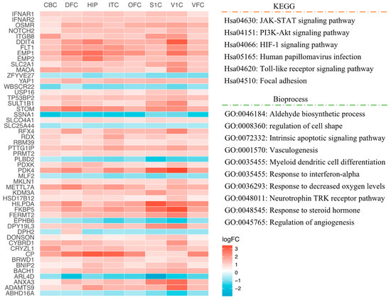 The heatmap shows overlapping genes in different brain regions (CBC, DFC, HIP, ITC, OFC, S1C, V1C, and VFC), as well as the signaling pathways and biological functions involved in these genes.