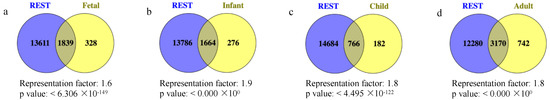 (a–d) The overlap between REST target genes and DEGs in fetal, infant, child and adult brains, respectively. The statistical significance of overlapping genes was tested using Fisher’s test, and all p values were less than 0.01.