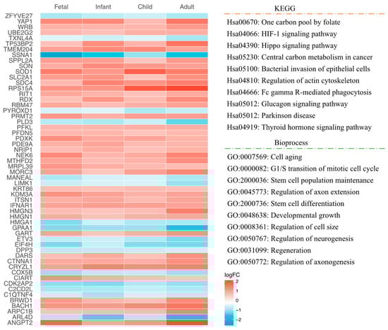 The heatmap shows overlapping genes in different age categories (Fetal, Infant, Child, Adult), as well as the signaling pathways and biological functions involved in these genes.