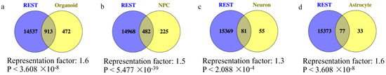 (a–d) The overlaps between REST target genes and DEGs in organoids, NPCs, neurons, and astrocytes, respectively. The statistical significance of overlapping genes was tested using Fisher’s test, and all p values were less than 0.01.