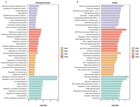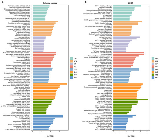 (a,b) Biological process and KEGG analysis for the REST-targeted DEGs in different brain regions.