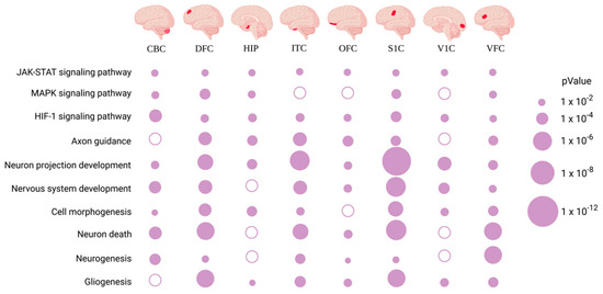 In eight human brain regions, the REST-targeted DEGs are highly involved in nervous system development, neuron projection development/maintenance, neurogenesis, cell morphogenesis, apoptotic/cell death, and cell signal transduction (Figure 6a). These genes are mainly involved in the HIF-1, axon guidance, MAPK, fatty acid degradation/metabolism, and Rap1 signaling pathways (Figure 6b). Through analysis of the common REST-targeted DEGs in all regions, we found that the JAK–STAT and HIF-1 signaling pathways were prevalent in all brain regions, and all genes involved in these signaling pathways were upregulated (Figure 2), suggesting a potential loss of REST repression. We summarized the most critical KEGG and GO results involving these regions in Figure 7.