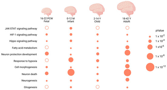 In the fetal brain, the REST-targeted DEGs were represented in ontologies related to the nervous system development, neuron differentiation/development, and neurogenesis. KEGG enrichment results showed that these genes are involved in cellular senescence, as well as pathways of neurodegeneration and apoptosis. In postnatal samples, GO enrichment results of the REST-targeted DEGs relate to processes, such as response to hypoxia, cell morphogenesis, neurogenesis, nervous system development, and axon guidance. The KEGG enrichment analysis revealed that these genes involved the HIF-1 and JAK–STAT signaling pathways and fatty acid degradation/metabolism. In adult samples, the REST-targeted DEGs were enriched for processes related to nervous system development, trans-synaptic signaling, modulation of synaptic transmission, and neurogenesis. The KEGG enrichment further revealed that these genes mainly engage in the HIF-1 and axon guidance signaling pathways and fatty acid degradation/metabolism (Figure 8). The analysis of the common REST-targeted DEGs in all age groups revealed that the Hippo and HIF-1 signaling pathways were prevalent in all age groups (Figure 4). We have summarized the common KEGG and GO results involved in each age group in Figure 9.