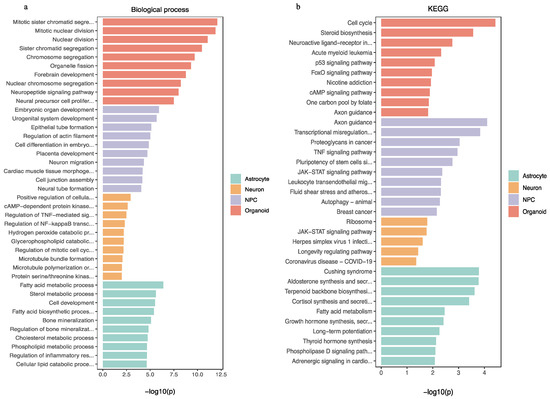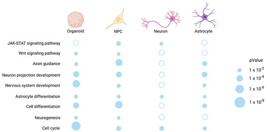 The REST-targeted DEGs in NPCs were enriched for biological processes related to the nervous system development, neurogenesis, axon development, and cell development/differentiation, which correspond to the KEGG JAK–STAT, Wnt, and axon guidance signaling pathways. The REST-targeted DEGs in neurons were found to be significantly enriched for cell cycle and immuno-inflammatory response processes, corresponding to the KEGG analysis’s JAK–STAT signaling pathway. DS-derived astrocytes (REST) targeted DEGs, and they were mainly involved in cell development/differentiation/migration and fatty acid degradation/metabolism processes. KEGG enrichment analysis revealed that these genes are involved in the JAK–STAT signaling pathway. The top 10 GO and KEGG enrichment results for NPCs, neurons, and astrocytes are presented in Figure 10a,b. We have summarized the common KEGG and GO results in organoids, NPCs, neurons and astrocytes, as shown in Figure 11.