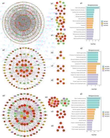(a1–a3) The PPI network of DEGs in NPCs, neurons, and astrocytes, respectively, were constructed using Cytoscape. Red represents the REST-targeted upregulated genes, green represents the REST-targeted downregulated genes, yellow represents the non-REST-targeted upregulated genes, and purple represents the non-REST-targeted downregulated genes. The larger the network node degree distribution, the larger the shape. (b1–b3, c1–c3, d1–d3) are the top three models obtained using the MCODE plug-in of Cytoscape in neuron DEGs in NPCs, neurons, and astrocytes, respectively. (e1–e3) The GO enrichment’s most significant five terms were shown in each top three critical models in neuron DEGs.
