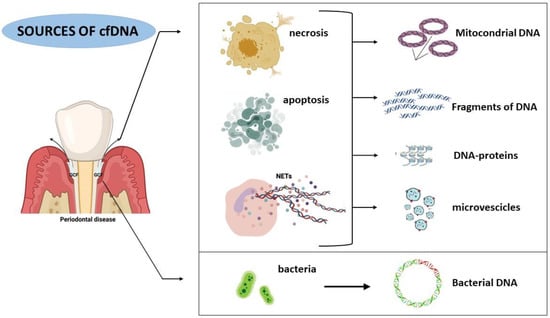 CfDNA was proposed as a new biomarker to study the disease’s evolution and progression in the periodontal field. A different concentration of cfDNA was seen among healthy patients, periodontally affected and gingivitis-affected patients []. Moreover, a recent study has shown therapeutic results in treating periodontitis in mice using nanoparticles that remove cfDNA []. The aim of this article is to report what was discovered about the relationship between cfDNA and periodontitis in the last few years. Additionally, it will underline the possible uses of cfDNA as a marker in periodontitis for diagnosis and therapy.