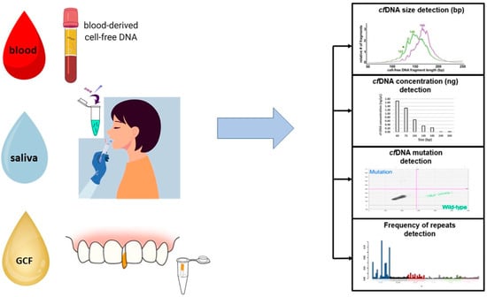 CfDNA could be a new instrument to understand the status of periodontitis status. The short length of cfDNA can be a limit for its search, but due to different new technological methods, today, its detection is possible [,,]. These methods are fluorescence [], genomic sequencing [] and polymerase chain reaction (PCR) []. In periodontology, cfDNA concentration was investigated in blood, saliva and gingival crevicular fluid (GCF) (Figure 2) []. Different studies have analyzed the level of cfDNA in periodontopathic patients and healthy patients in these different biofluids.