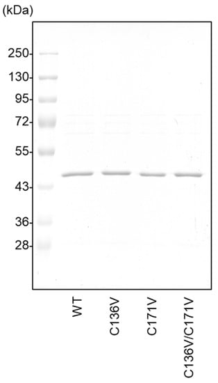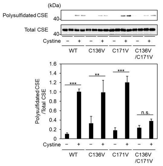 The above experiments clearly show the susceptibility of Cys136 residues in CSE to persulfides and polysulfides. We developed a biotin-polyethylene glycol-conjugated maleimide (biotin-PEG-MAL) capture method, by which the polysulfidated proteins can be eluted by adsorbing biotin-PEG-MAL-modified proteins to immobilized avidin resin and cleaving polysulfides with a reducing agent [,]. We examined whether Cys136 and/or Cys171 residues in CSE are accessible to polysulfidation during catalysis using a biotin-PEG-MAL capture assay. Using densitometric analysis of CSE polysulfidation in a biotin-PEG-MAL capture assay and aliquots of CSEs that had not been subjected to the assay (“Total CSE”), we observed that incubation with cystine led to an increase either in wild-type, C136V, or C171V CSE polysulfidation. Meanwhile, these increases were not observed in the C136V/C171V mutants, indicating that simultaneous polysulfidation of Cys136 and Cys171 occurred and that individual polysulfidation of either residue was not detected in the assay conditions employed in the study (Figure 6).