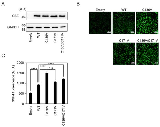We recently reported that fluorescence analyses of SSP4, which determine its high selectivity and sensitivity to sulfane sulfurs, even with the interfering presence of other species, such as amino acids and metal ions []. We also examined the β-lyase activity toward cystine to generate Cys-SSH in COS-7 cells, expressing wild-type, C136V, C171V, or C136V/C171V CSE. There was an equal amount of CSE in cells over-expressing each CSE examined by Western blotting using the anti-CSE antibody (Figure 2A). Endogenous CSE could not be detected because of its negligible expression compared to that of overexpressed CSEs. There was a similar SSP4 fluorescence in wild-type or C171V CSE-expressing cells. Meanwhile, there was a significant increase in SSP4 fluorescence in C136V or C136V/C171V CSE-expressing cells, when compared with wild-type CSE-expressing cells (Figure 2B,C). On the other hand, the γ-lyase activity toward cystathionine to generate cysteine did not change in C136V/C171V, as compared to wild-type CSE (Figure 3). These results demonstrate that the downregulation of CSE selectively occurred during the β-lyase step to synthesize Cys-SSH from cystine via Cys136 and/or Cys171 modifications.