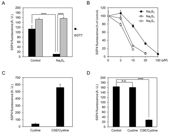 Effect of exogeneous polysulfides on CSE β-lyase activity toward cystine. (A) The immobilized CSE was pre-incubated with 10 µM Na2S4 for 10 min at 30 °C. Na2Sn (n = 2–4) were removed by centrifugation, and CSE activity was assayed in the presence of 50 µM PLP and 1 mM cystine. The synthesized Cys-SSH levels in each reaction mixture were measured by the SSP4 probe. For the DTT sample, an additional incubation with 20 mM DTT (20 min at 30 °C) was performed prior to assessment. (B) The immobilized CSE was pre-incubated with indicated concentrations of Na2Sn (n = 2–4) for 10 min at 30 °C. CSE activity in each reaction mixture was assayed in the presence of 50 µM PLP and 1 mM cystine, as described in panel A. (C) Cys-SSH was generated by purified CSE in the buffer containing 50 µM PLP and 1 mM cystine, either in the presence (CSE/Cystine) or absence (Cystine) of CSE. An aliquot of reaction mixture was subjected to the SSP4 assay. (D) Proportional amounts of either each reaction mixture in panel C or buffer alone (Control) were initially incubated with the immobilized CSE for 10 min at 30 °C. CSE activity in each reaction mixture was assayed in the presence of 50 µM PLP and 1 mM cystine, as described in panel A. Results are the mean ± SE of three-four independent experiments. **** p < 0.0001 when compared with control or indicated column. n.s.; not significant.