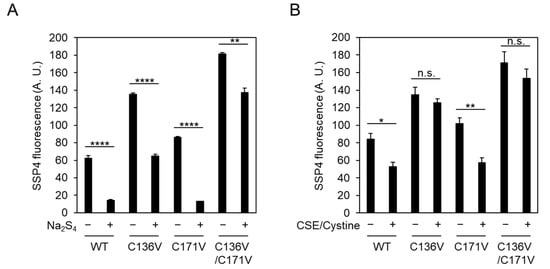 Effect of exogeneous polysulfides on CSE β-lyase activity toward cystine on the CSE mutants. Immobilized wild-type (WT) or indicated mutants CSE were incubated with 10 µM Na2S4 (A) or Cys-SSH synthesized by CSE/cystine (B), as described in Figure 4 at 37 °C for 30 min. CSE activity was measured by SSP4, as mentioned in Figure 4. Results are the mean ± SE of four to six independent experiments. **** p < 0.0001, ** p < 0.01, and * p < 0.05 when compared with the controls of each sample without polysulfides. n.s.: not significant.
