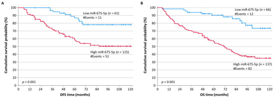 Kaplan–Meier survival curves for the disease-free survival (DFS) and overall survival (OS) of colorectal cancer (CRC) patients. Patients with tumors highly expressing miR-675-5p had significantly shorter DFS (A) and OS (B) time intervals than patients bearing tumors with low miR-675-5p levels. The p-values were calculated using the Mantel-Cox (log-rank) test.