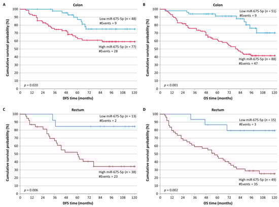 When stratifying CRC patients according to the tumor location, we noticed that patients with colon tumors (n = 125 out of 175 for DFS and n = 139 out of 203 for OS) and high levels of miR-675-5p showed significantly shorter DFS intervals (p = 0.020) and OS intervals (p < 0.001) (Figure 3A,B). Similarly, as shown in Figure 3C,D, CRC patients with rectum tumors (n = 50 out of 175 for DFS and n = 64 out of 203 for OS) and low levels of miR-675-5p had significantly higher probabilities for both DFS (p = 0.006) and OS (p = 0.002).