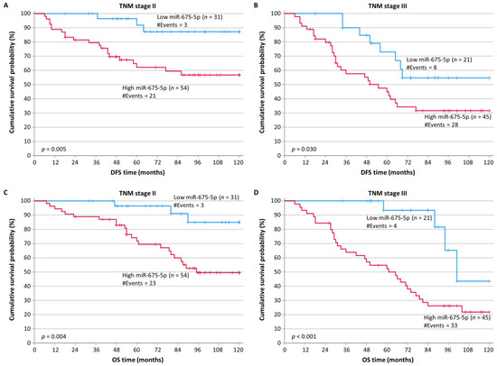 Stratified Kaplan–Meier survival curves for the disease-free survival (DFS) and overall survival (OS) of colorectal cancer (CRC) patients, according to TNM stage. Patients with tumors expressing a high level of miR-675-5p at TNM stages II (A) and III (B) had shorter DFS times than patients with tumors expressing a low level of miR-675-5p. Additionally, OS was worse for CRC patients with TNM stage II (C) or stage III (D) colorectal cancers overexpressing miR-675-5p compared to those with lower expression of this miRNA at the same TNM stage. The p-values were calculated using the Mantel–Cox (log-rank) test.