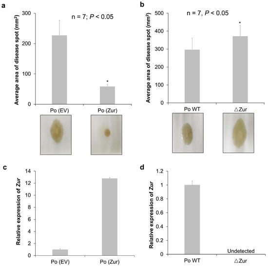 To identify the role of the Zur in the virulence of P. odoriferum BCS7, Zur-overexpression (Po (Zur)) and Zur-knockout (ΔZur) strains were constructed and used to inoculate Chinese cabbage petioles. The lesion area was measured at 24 h post-inoculation for each strain (including the control strains). Plants inoculated with Po (Zur) displayed a smaller lesion area compared to those inoculated with the control strain Po (EV) (p < 0.05), whereas the Zur mutant strain (ΔZur) induced a larger lesion area than the wild-type strain Po BCS7 (Po WT) (p < 0.05) (Figure 1a,b). Zur expression in the Po (Zur) and ΔZur were confirmed using qPCR (Figure 1c,d). These results suggest that the Zur in P. odoriferum BCS7 plays a negative role in virulence.