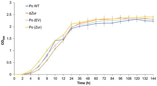 Growth curve over 6 days (144 h) of ΔZur and Po (Zur). The assay was repeated three times independently, and similar trends were found. The results of one experiment are shown. Values are the mean ± SD (n = 3). Po WT: wild-type strain of Po BCS7, which was used as a control for ΔZur; Po (EV): Po BCS7 strain harboring an empty vector, which was used as a control for Po (Zur).