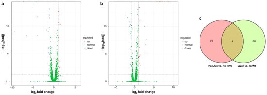 Differentially expressed genes (DEGs) of Po (Zur) vs. Po (EV) and ΔZur vs. Po WT. Volcano plots of DEGs detected in Po (Zur) vs. Po (EV) (a) and ΔZur vs. Po WT (b) are shown. Each dot represents one gene with the y-axis showing −log10 (padj) and the x-axis showing the log2 fold change. The red, blue, and green dots represent the upregulated DEGs (padj < 0.05 and log2 fold change ≥ 1)), downregulated DEGs (padj < 0.05 and log2 fold change ≤−1), and genes that were not significantly regulated, respectively. padj: adjusted p-value. (c) Venn diagram of DEGs identified in Po (Zur) vs. Po (EV) and ΔZur vs. Po WT.