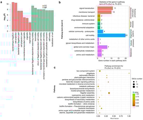 Functional classification of the differentially expressed genes (DEGs) of Po (Zur) vs. Po (EV) according to the gene ontology (GO) database and Kyoto Encyclopedia of Genes and Genomes (KEGG) database. (a) GO enrichment analysis of the DEGs. All GO terms with a p-value threshold of 0.05 in the main categories of cellular component (CC) and biological process (BP) are included, and no DEGs are enriched in the category of molecular function. (b) KEGG classification of DEGs. The x-axis shows the number of DEGs in each pathway term, and the number of DEGs is indicated at the top of the bar. (c) The top 20 pathways enriched by performing KEGG analysis of the DEGs.