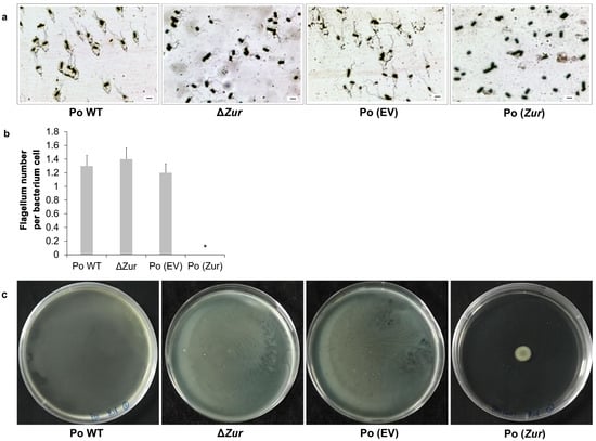 Flagellum staining and quantification of the four strains, Po (Zur), Po (EV), ΔZur, and Po WT, showed that the Po (Zur) exhibited significantly less flagellum (none) in comparison with the control strain Po (EV) (1–2 flagella per bacterium cell) (p < 0.05), while the ΔZur had no obvious difference in the number of flagella in comparison with the control strain Po WT, both having 1–2 flagella per bacterium cell (p > 0.05) (Figure 6a,b). These results indicate that Zur overexpression negatively affects the development of flagella in P. odoriferum, while depletion of the Zur does not.