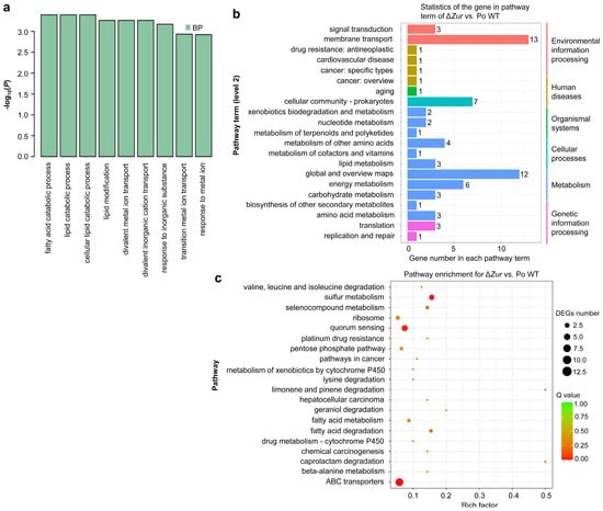 Functional classification of the differentially expressed genes (DEGs) of ΔZur vs. Po WT according to the gene ontology (GO) database and Kyoto Encyclopedia of Genes and Genomes (KEGG) database. (a) GO enrichment analysis of the DEGs. All the GO terms with a p-value threshold of 0.05 in the main category of biological process (BP) are indicated and there is no DEG enriched in the categories of cellular component and molecular function. (b) KEGG classification of DEGs. The x-axis shows the number of DEGs in each pathway term, and the number of DEGs is indicated at the top of the bar. (c) The top 20 pathways enriched by performing KEGG analysis of the DEGs.