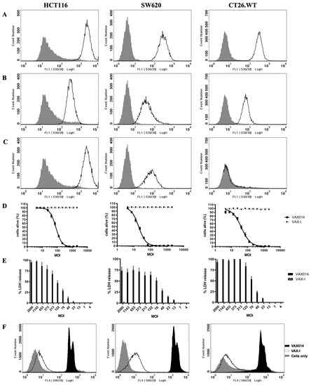 Target validation and VAX014-mediated killing of CRC in vitro. Colon cancer cell lines HCT116, SW620, and CT26.WT were assessed for β1 (A) α5 (B), and α3 (C) integrin expression levels (white with black lines) by FACS analyses when compared to isotype controls (grey). Gates were established using forward and side scatter plots. (D) CRC cell viability, measured by Prestoblue™ viability dye, was assessed after 2 h coincubation with increasing concentrations of rBMC to mammalian cell ratios (MOI) of VAX014 and control rBMC VAX-I, lacking the PFO toxin payload. (E) Oncolysis via lactate dehydrogenase release (% LDH release) was assessed by lactate dehydrogenase activity in supernatant after 2 h coincubation with VAX014 and VAX-I. (F) VAX014-mediated membrane permeabilization was evaluated by FACS analyses of propidium iodide-stained CRC cells treated with equal numbers of VAX-I and VAX014 rBMCs for 2 h and compared to cells only (untreated) control.