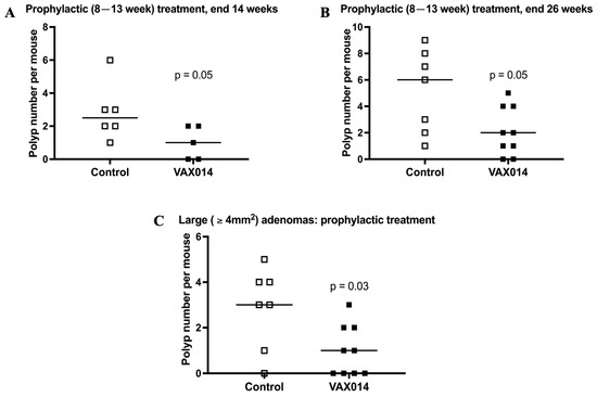 Prophylactic VAX014 adenoma inhibition in the Fabp-CreXApcfl468 mouse model of colon cancer. Total polyp number was assessed in Fabp-CreXApcfl468 mice treated with VAX014 as a prophylactic (8–13 weeks), administered intrarectally 1X/week, at (A) 14 weeks (VAX014 n = 6, Control n = 5), around the time of macroscopic polyp development, and (B) 26 weeks (VAX014 n = 9, Control n = 7). The abundance of large, ≥4 mm2, adenomas (C) was quantified between control and VAX014 prophylactic treatment groups (VAX014 n = 9, Control n = 7).