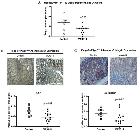 VAX014 treatment in animals 14–19 weeks of age, in the presence of detectable adenomas, significantly reduced polyp number (Figure 3A; p = 0.03), but not large tumor frequency (≥4 mm2), at 26 weeks of age (Supplementary Figure S2B; p = 0.64). The effects of VAX014 on adenoma tissues were investigated using a cohort of Fabp-CreXApcfl468 mice with well-developed adenomas treated at 22–24 weeks of age and sacrificed one-hour after the final treatment to allow rBMC interaction with the colonic mucosa. In this group, adenomas from VAX014-treated mice exhibited a significant reduction in Ki67 (Figure 3B, p = 0.02), a marker of cell proliferation, in IHC analyses. These data strongly suggest that neoadjuvant VAX014 treatment decreases tumor abundance through reduced tumor cell proliferation in vivo. Interestingly, α3 integrin (Figure 3C, p = 0.02) expression was also significantly decreased in these VAX014-treated tumors, but beta-1 (β1) integrin expression was not affected in this group (Supplementary Figure S2C, p = 0.25).