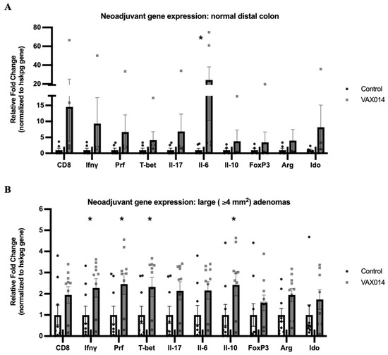 VAX014 induction of antitumor immune gene expression in adenomas. Cytokine markers of inflammation, anti-tumor immune responses, and immune repression were analyzed in colon tissues isolated from Fabp-CreXApcfl468 mice treated with neoadjuvant VAX014 (14–19 weeks). Analysis of immune gene markers isolated from macroscopically normal colon tissues (A) (VAX014 n = 6, Control n = 6) and large, ≥4 mm2, adenomas (B) (VAX014 n = 10, Control n = 9) harvested and frozen at 26 weeks. Means with standard error of the mean (SEM) are displayed on graphs; the Mann–Whitney U test was used to test significance. * p < 0.05.