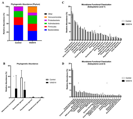 VAX014 induced modulation of the colonic microbiome. Microbiomes isolated from colon tissues directly adjacent to adenomatous polyps from 26-week-old mice from the neoadjuvant treatment group (VAX014 n = 5, Control n = 3). Taxonomic abundance of microbiome populations was assessed at the phylum (A) and species (B) levels of classification using assembled contigs and all NCBI sequenced prokaryotes, as of April 2018. Annotation of gene function using paired-end reads, the SEED systems database, and SUPER-FOCUS annotation evaluated gene abundances in colonic microbiome at Subsystems level 1 (C) and Subsystems level 2 (D) categories. Mean values with standard deviations are represented on graphs. Statistical significance was assessed using the Mann–Whitney U test. * p < 0.05.