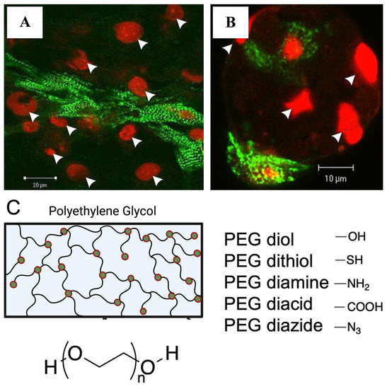 Functionalisation strategies, such as peptide modification and addition of functional groups to facilitate cell attachment onto synthetic hydrogels. (A,B). Attachment of rat ventricular cardiomyocytes to RGD modified alginate hydrogels compared to fewer cardiomyocytes attached to unmodified alginate hydrogels. Cardiomyocytes stained with α-actinin (green), nucleus stain with PI (red), white arrows indicate cell nuclei. Figure reproduced by Shachar et al., 2011 [27]. (C). Various end groups utilized for polyethylene glycol hydrogel functionalization.