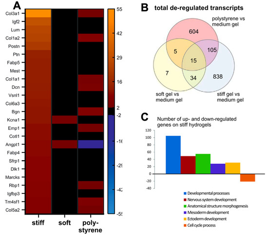 Transcriptomic profiles obtained from gene expression arrays of iPSC–CMs on polyacrylamide hydrogels of varying stiffnesses, portraying gene expression changes on hydrogels. (A). Gene expression profiles are altered when cells are cultured on PAA hydrogels of 12 kPa (soft) and 123 kPa (stiff), with increased expression of collagen proteins on stiffer substrates. (B). Venn diagram of gene ontology analysis of de-regulated pathways (C). De-regulated pathways from gene ontology analysis detected from CMs cultured on medium (30 kPa) and stiff (123 kPa) hydrogels. Figure reproduced from Heras-Bautista et al., 2019 [43].