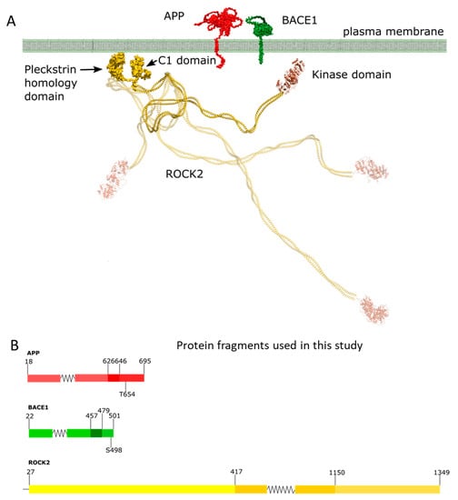 Both BACE1 and APP are transmembrane proteins with short intracellular tails, while ROCK2 is an intracellular protein anchored to the membrane through its C-terminal regulatory domains. To avoid having to work with the full-sized proteins, we simplified the problem to those domains of the proteins which are in the same compartment, namely the C-terminal tails of BACE1 and APP, alongside ROCK2 kinase.