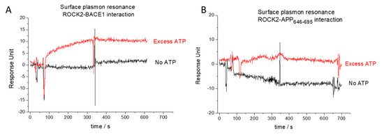 Surface plasmon resonance analysis of binary interaction between ROCK2 and its ligands. Weak interaction was detected between ROCK2 and BACE1 only in the presence of excess ATP (red curve on (panel A)), while this interaction was not observed without ATP (black curve on (panel B)). No binary interaction was detected between ROCK2 and APP646–695, either in the presence (red curve on (panel B)) or absence of ATP (black curve on (panel B)).