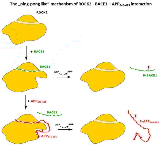 Scheme of the proposed ping-pong-like mechanism for the interaction and phosphorylation of BACE1 and APP by ROCK2 kinase. The kinase domain presents a canonical substrate-binding groove where the C-terminal peptide of BACE1 can bind. Upon the binding of BACE1, a conformational change occurs, creating a new allosteric binding site on ROCK2, which APP can interact with. The phosphorylation of BACE1 and the dissociation of p-BACE1 restores the initial state of ROCK2. When APP binds to the distorted ROCK2, BACE1 dissociates without the phosphorylation event but ROCK2 can phosphorylate APP. The dissociation of p-APP leads to the original ROCK2 conformation.