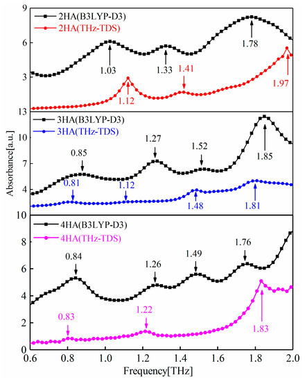Figure 1 shows the THz-TDS-obtained and B3LYP-D3-simulated spectra of 2-, 3-, and 4-HA. Evidently, the calculated peaks at 1.03 THz and 1.33 THz correspond to the measured peaks at 1.12 THz and 1.41 THz in 2-HA, while 0.85 THz, 1.52 THz, and 1.85 THz of calculated peaks correspond with the measured peaks at 0.81 THz, 1.48 THz, and 1.81 THz, respectively, in 3-HA. Similarly, in 4-HA, 0.84 THz, 1.26 THz, and 1.76 THz correspond with 0.83 THz, 1.22 THz, and 1.83 THz of the measured peaks, respectively.